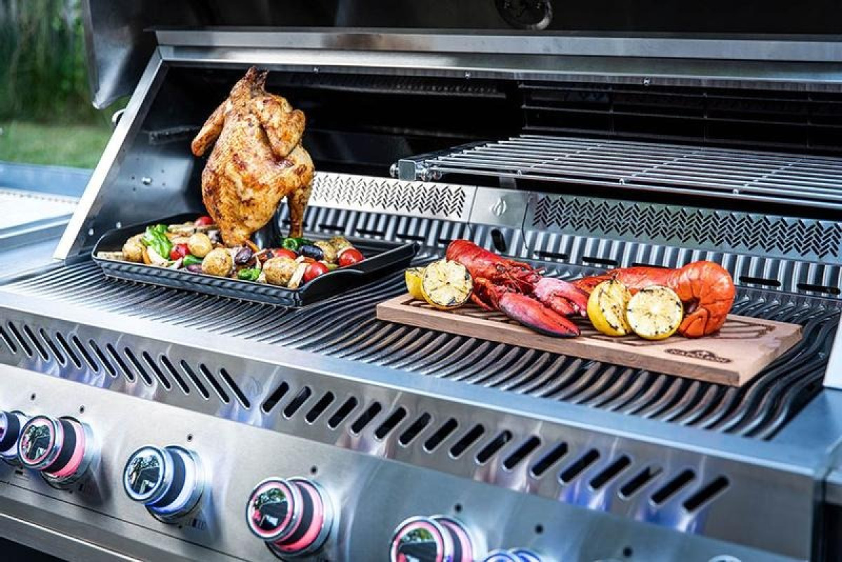 Incluye encendido individual JETFIRE, luces interiores halógenas, mandos SafetyGlow (que cambian de color al encenderse), un termómetro Accu-Probe, y un kit de rostizador con motor integrado. También tiene placas de sellado para mejor sabor y menos llamaradas. Está diseñado para integrarse fácilmente en cocinas exteriores y cuenta con garantía limitada de por vida.